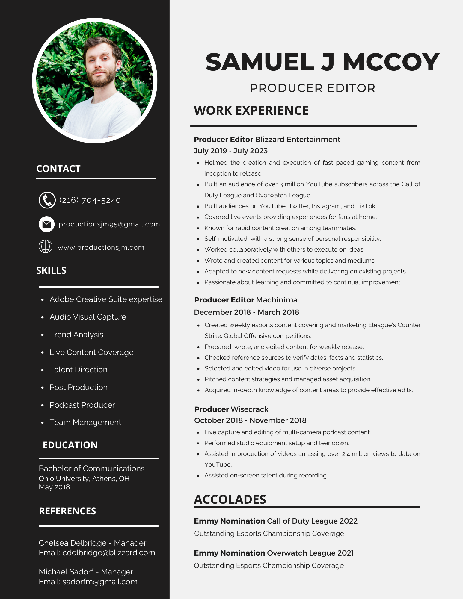 Since then, Samuel has been honored to work with some of the biggest names in online entertainment to wow audiences and build brands. Be it live editing the Wisecast podcast, breaking down gaming highlights at Machinima, or launching social media for two esports leagues at Activision Blizzard, Samuel is always prepared to create something stunning.